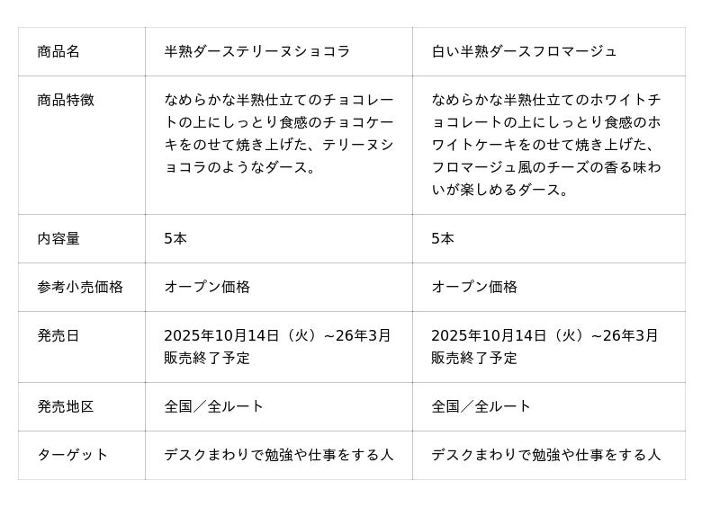 森永製菓株式会社(東京都港区芝浦、代表取締役社長 COO・森 信也)は、「ダース」ブランドより、「半熟ダーステリーヌショコラ」、「白い半熟ダースフロマージュ」を、10 月 14 日(火)から発売いたします。