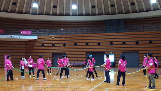 台風の目:チームで力を合わせ、一本の棒をつないでいくリレー競技