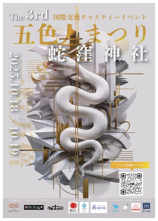一般社団法人 SAKE OF PEACE(セイク オブ ピース/本社:中央区銀座,代表理事:KAZ ) は、2025年10月18日(土)・19日(日)の2日間、東京都品川区の蛇窪神社(白蛇さまの神社)にて、「第3回 五色人まつり&KIDS SCHOOL」を開催いたします。本イベントは、"祈りと平和をつなぐ祭典"をテーマに、子どもたちが文化や言葉の違いを越えて学び合い、地域・家族・世界を結ぶ教育と多様性の祭典です。今年は巳年にちなみ、「再生と繁栄の象徴」である白蛇を祀る蛇窪神社を舞台に、学び・芸術・祈りが融合した国際チャリティイベントとして開催されます。