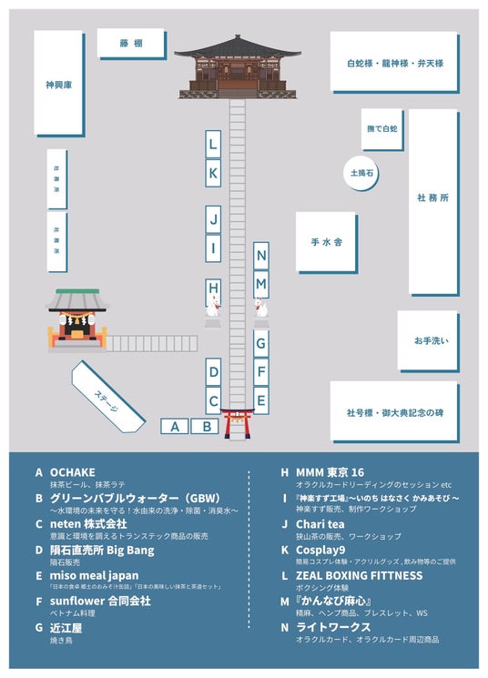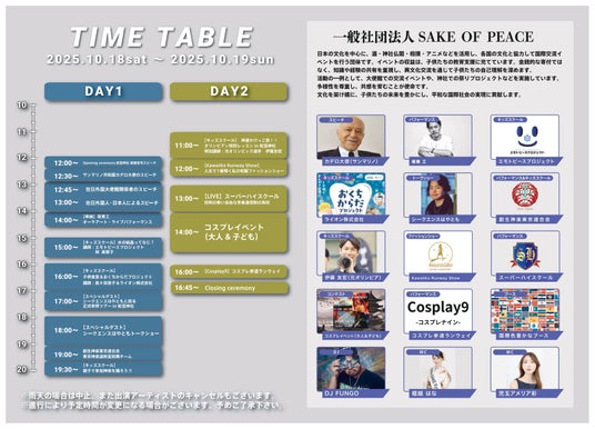 日時:2025年10月18日(土)12:00~20:00, 2025年10月19日(日)11:00~17:00 会場: 蛇窪神社(東京都品川区二葉4-4-12),入場料: 無料 主催: 一般社団法人 SAKE OF PEACE: メインスポンサー: BIG BANG 隕石直売所/neten株式会社後援: 観光庁/文部科学省/品川区 :協力: 蛇窪神社/EMIU/クローバーこどもクリニック/TOKYO INTERNATIONAL FRIENDS AND EVENTS/口コミ365