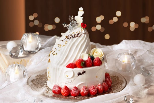 [ 商品紹介 ]:贅沢に使用した苺と優しい甘さの生クリームを合わせた、華やかな王道のショートケーキです。結婚式で多くのお客様に愛されてきたレシピを基に、ふんわりとしたスポンジと口どけの軽やかなクリームで仕上げました。トップには雪の結晶をかたどった繊細なチョコレートをあしらい、側面にはゴールドのアクセントを添えて、聖夜にふさわしい華やかさをプラス。ウェディングパティシエが手がけるからこそ生まれた、シンプルでありながら上品な"記念日の一台"です。