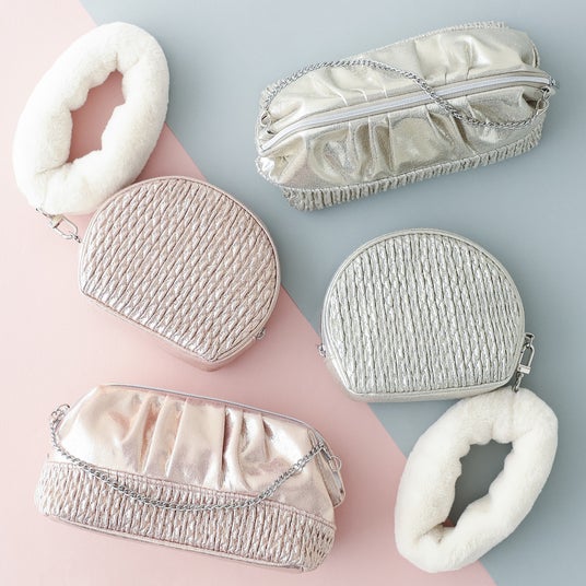 ホリデーシーズンのお出かけにぴったりなキラキラとした素材感が魅力のポーチです。合皮素材にくしゅくしゅとした圧縮加工を施し、立体感と輝きをプラスしました。ポーチには取り外し可能なファーハンドル付き、ワイヤーポーチはチェーンハンドル付きで、ちょっとしたお出かけのパーティーバッグとしても活躍します。