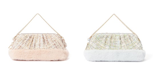 あたたかみのあるツイードにふわふわのファーを組み合わせた、ホリデー気分を盛り上げるポーチです。ニュアンスカラーのツイードが温かみを演出し、ファーとの切替が華やかなアクセントに。ポーチには取り外し可能なファーハンドル付き、ワイヤーポーチはチェーンハンドル付きで、ちょっとしたお出かけのパーティーバッグとしても活躍します。