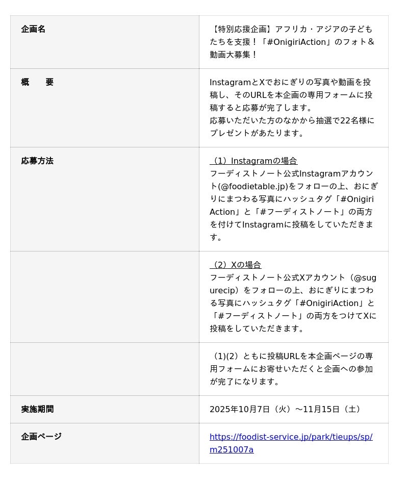 約3万人の「フーディスト(R)(料理インフルエンサー/料理クリエイター)※」が参加する、日本最大級の料理インフルエンサーネットワーク事業「フーディストサービス( https://foodist-service.jp/ )」を展開するアイランド株式会社(本社:東京都渋谷区、代表取締役:粟飯原理咲)は、運営メディアである、「フーディストノート」にて、世界の食料問題の解決に取り組む特定非営利活動法人「TABLE FOR TWO International (以下、TFT)」が主催する「おにぎりアクション2025」サポーティングパートナーとしての応援企画をスタートしました。