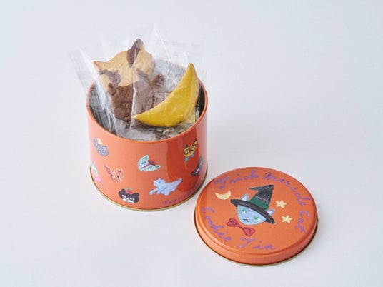 ハロウイーンカラーのパンプキンオレンジに包まれた缶に、かぼちゃやフランケンシュタインを思わせる表情豊かな猫たちが大集合し、"猫たちのハロウイーン夜会"が広がります。缶の中には、発酵バターをたっぷり使った、定番の猫モチーフのクッキーと三日月のレモンアイシングクッキーをぎゅっと詰めました。