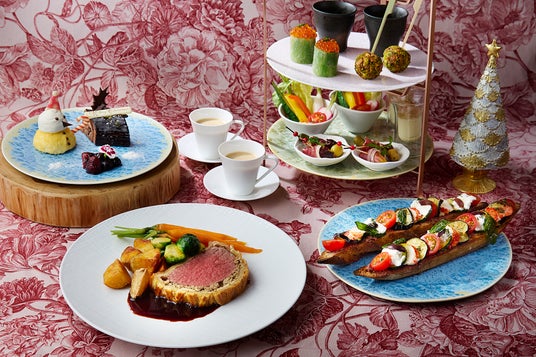 「ザ・ロビーラウンジ」で提供するクリスマスディナーでは、伝統的なクリスマスの雰囲気を感じながら、特別な夜をお迎えいただけます。ロブスターのタルティーヌ、たっぷりのいくらを乗せたサーモンロール、蟹のカクテルなど、冬に旬を迎えるシーフードをふんだんに取り入れた前菜は、トリュフなどの贅沢な食材とともに、まるでアフタヌーンティーのようにスタンドに美しく盛り付けられています。メインには、イギリスのホリデーシーズンを象徴する伝統料理「ビーフウェリントン」をご用意。パイの中で蒸し焼きにされた柔らかな牛フィレ肉に、芳醇な赤ワインソースを添えて仕上げました。デザートには、クリスマスの定番スイーツ「ブッシュ・ド・ノエル」をはじめ、「レアチーズケーキのスノーマン」や「ベリーのコンポート」が、聖夜の締めくくりを華やかに演出します。