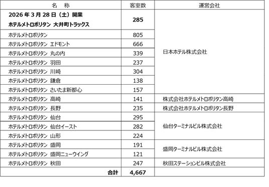 日本ホテル株式会社(代表取締役社長:三林宏幸)は、JR東日本グループが開発を進める複合施設「大井町トラックス」に、2026年3月28日(土)ホテルメトロポリタン大井町トラックス(総支配人:大矢一憲)を開業いたします。これに伴い2025年10月9日(木)午前10時より宿泊予約を開始いたします。