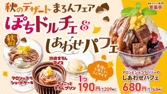 【安楽亭でほっこり、しあわせ】10月8日~栗のやさしい甘みと秋の彩りを楽しむひととき♪季節限定パフェとぽちドルチェ3種が秋風に誘われて新登場!マロンパフェ&ぽちドルチェでしあわせスイーツタイムを!
