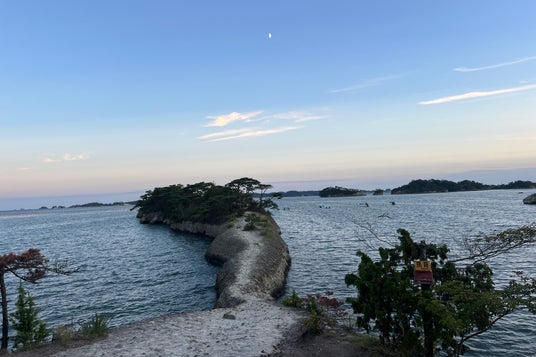 日が落ちる頃には、松島湾に浮かぶ島々が夕陽に染まり、昼間の喧騒とはまるで別世界の風景が広がる。人のいない松島を、ゆっくりと独り占めする贅沢な時間が流れる。