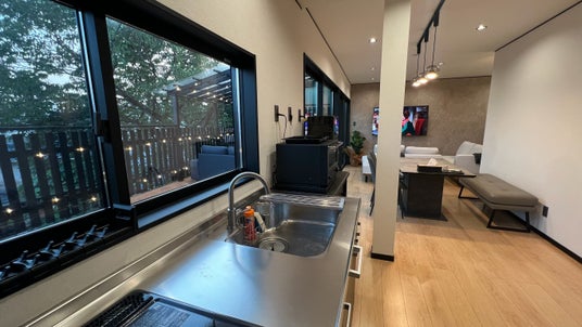 雨の日でも安心の広々した屋根付きウッドデッキを備え