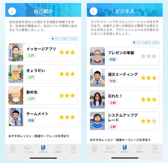 - 初級者:・「入門」「初級」と記載のある会話や自分の興味のあるトピック・話したいAIバディを選んで積極的に話してみましょう。リラックスして、相手の声もよく聞きながら会話を楽しみましょう。・同じ会話を複数回プレイしてみましょう。2回目以降は、フィードバック画面で提案された表現を使ったり、内容を変えてみたり、変化をつけるのがおすすめです。・「バディチャット」での会話前や会話後に、テーマ画面内にある「おすすめレッスン」から、キーフレーズの使い方を学習しましょう。