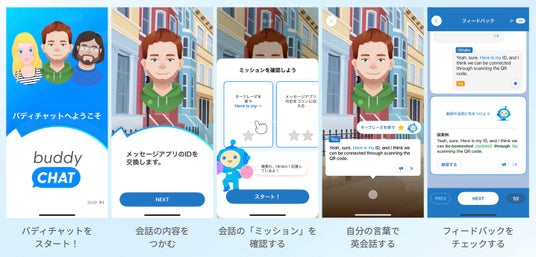 多様な個性を持つAIバディとスマートフォン上でリアルな英会話を楽しめる機能。