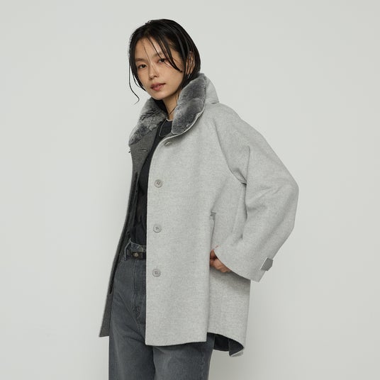 ベストセラーのAラインショートコートよこ糸にコート原料では極上といわれるアンゴラを100%使用。丁寧な起毛(ショートフリース)加工を施し、ふっくらとした柔らかさとドレープ性を楽しめます。特殊加工で、生地表面にビロードのような美しい光沢のある表情をプラス。