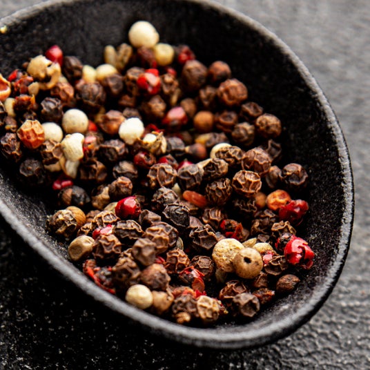 3.3種のペッパーのスパイシーなアクセント「思わずお酒が止まらなくなる」ようなアクセントを効かせるために、食感や味わいの異なる3種のペッパーを加えました。ピリリとした刺激を持つブラックペッパーと繊細な風味のホワイトペッパーをベースに、噛んだ瞬間に華やかな香りが広がる粒状のピンクペッパーを少量使用しました。3種のペッパーの奥深い刺激と余韻が、お酒の香りや旨味を引き立て優雅なハーモニーを奏でます。