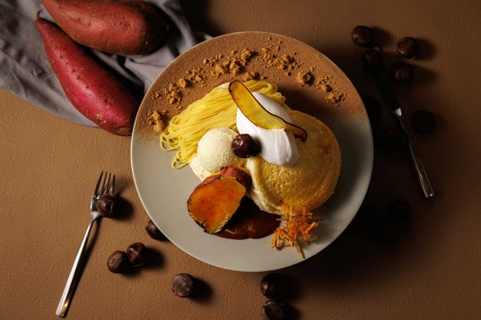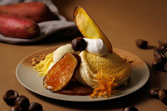 仕上げにさつま芋チップを飾り、和と洋の甘味が調和した、秋ならではの至福のパンケーキに仕上げました。