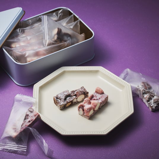 チョコレートにマシュマロやバタークッキー、ナッツを混ぜ込み、ザクザクっとしながらも、ふわっと軽やかな食感を楽しめる新感覚のロッキーチョコレート。パウダーシュガーのやさしい甘さが全体を包み込み、ひと口ごとに異なる表情を楽しめます。秋の贈り物やハロウィンギフトにも最適です。(10個入・ビター5個、ルビー5個)