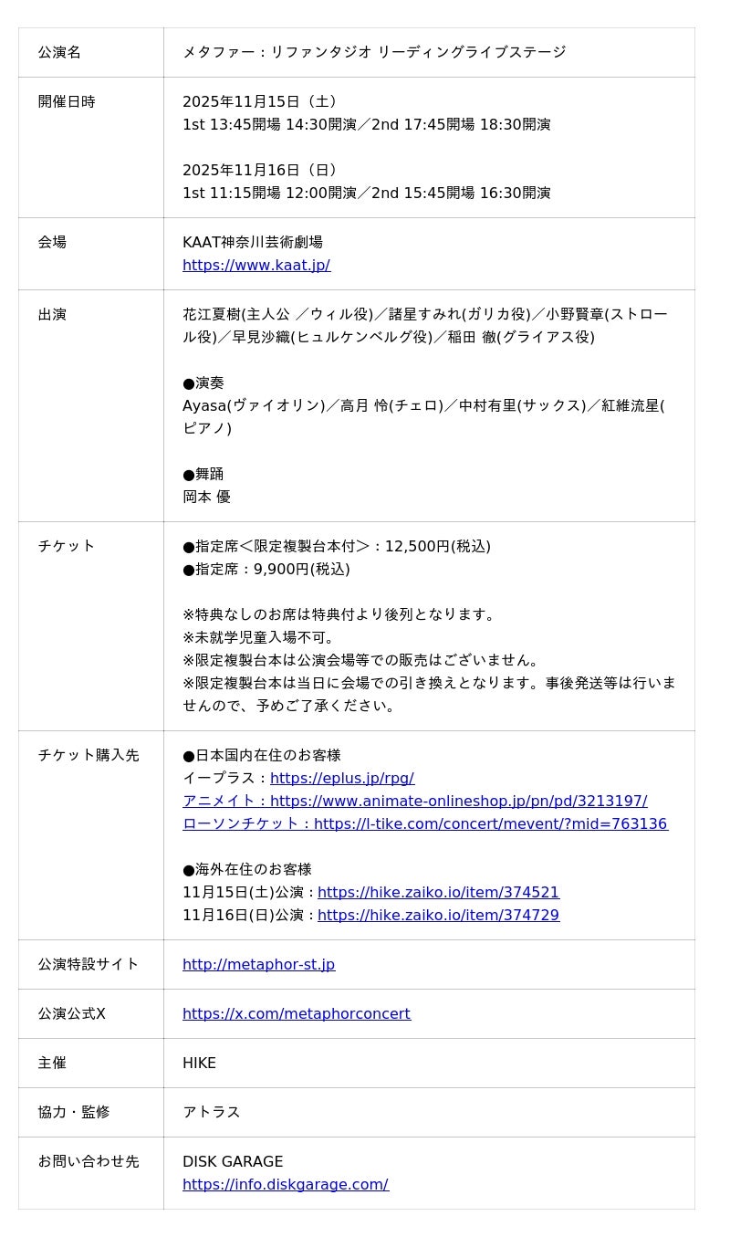 株式会社HIKE(本社:東京都新宿区、代表:三上政高)が主催・制作する、『メタファー:リファンタジオ リーディングライブステージ』(日程:2025年11月15日(土)、16日(日)/会場:KAAT 神奈川芸術劇場)のチケット一般発売が本日よりスタートしました。あわせて、全公演後のアフタートークにおいて出演キャストのサイン入り複製台本が当たる抽選会を実施します。キャストサイン入りポスターが当たるSNSキャンペーンも行いますので、ぜひ公演公式Xアカウントをご確認ください。