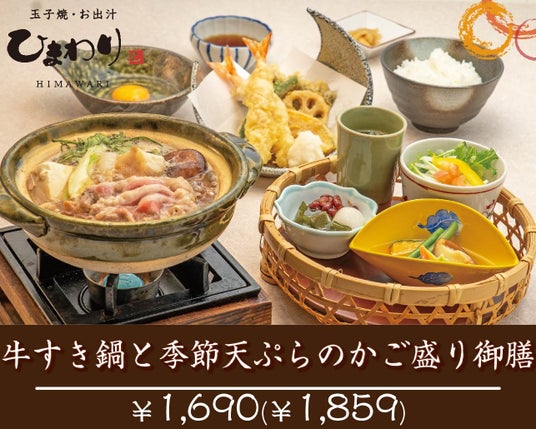 10月から、玉子焼・お出汁ひまわりのグランドメニューをリニューアルしています。名物玉子焼(明石焼)がセットになった「玉子焼と小さな華味鳥の鍋焼きうどん」や秋冬限定「牛すき鍋御膳」、「広島県産かきフライと季節の天ぷら御膳」等、アツアツ、ぐつぐつのおいしさが楽しめる秋冬ならではのメニューを新たに発売しています。次第に肌寒くなり始めたこの季節に、「玉子焼・お出汁ひまわり」のグランドメニューをぜひお楽しみください。