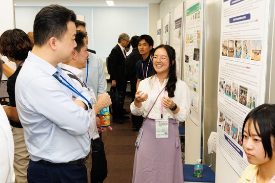 学校での国際交流活動内容を、ポスタセッションにて英語で紹介している豊田高専の学生