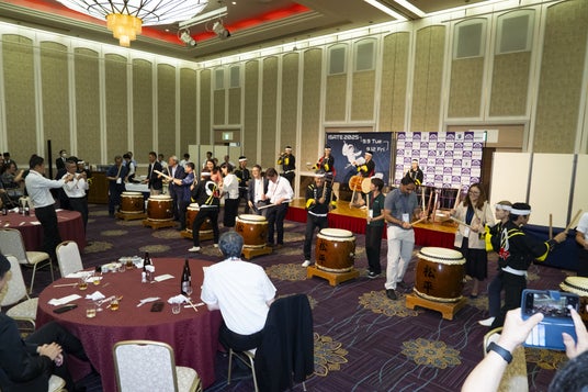 地元松平太鼓の演奏では、参加者も一緒に演奏し、交流を深めました