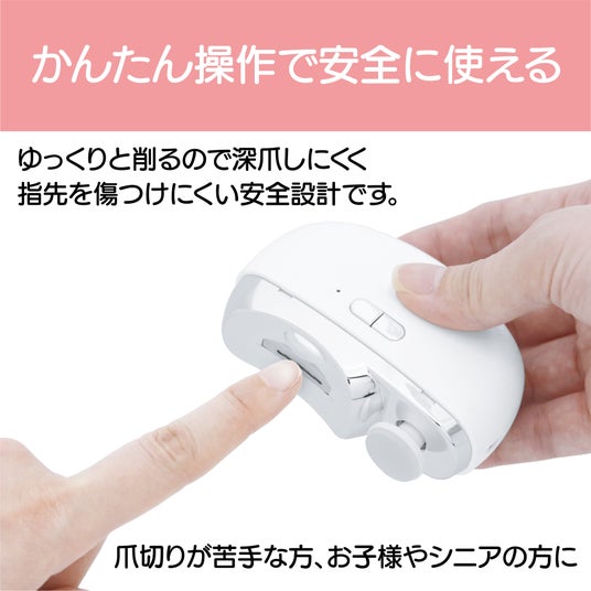 従来の爪切りとは異なり、力を入れて握る必要がなく、爪に軽く押し当てるだけでかんたんに爪のお手入れができる「電動ネイルトリマー」。爪をゆっくりと丁寧に削るため、深爪や切りすぎの心配が少なく、指先を傷つけにくい安全設計です。さらに、仕上げ用のポリッシャーを搭載しており、爪先を滑らかに美しく仕上げることができます。