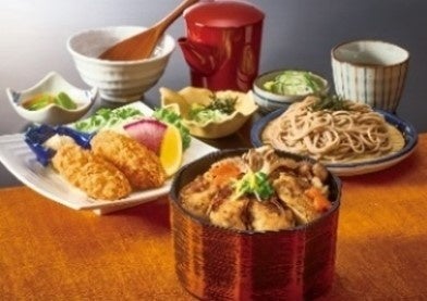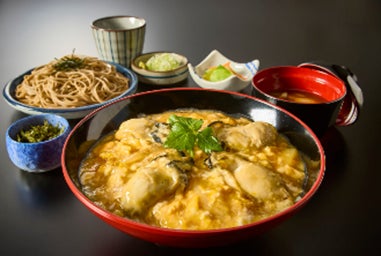 『"広島名物"牡蠣丼と麺(牡蠣入りみそ汁付き)』 1,860円 広島名物"牡蠣丼"と、サガミ自慢のお蕎麦を組み合わせたセットです。丼には、広島県産の大粒牡蠣を4粒使用し、ふんわりとろける玉子でやさしくとじました。
