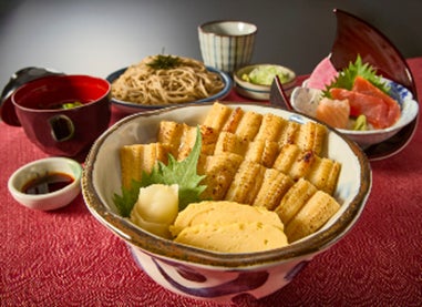 旨みが詰まったあなごは、一口ごとに香ばしさと豊かな味わいが広がります。贅沢に1.5尾分を使用しており、食べ応えも抜群。サガミ自慢のお蕎麦・お刺身・吸い物が付いた御膳です。