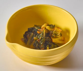 『広島菜キムチ』 390円 広島名産の「広島菜」を使用したキムチです。大きな葉とほどよい歯ざわりが特長の広島菜に、唐辛子の辛みと発酵の旨みを加えることで、さっぱりとしながらも奥行きのある味わいです。
