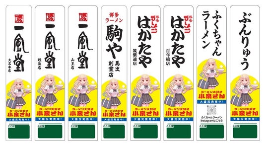 福岡修学旅行編に登場するラーメン店と小泉さんが電柱広告でコラボ!また、「駒や」「はかたや」「ふくちゃんラーメン」「ぶんりゅう」店内ではポスター掲出やオリジナルカード配布も。電柱広告は各店舗付近に掲出中、この機会にぜひ足をお運びください。