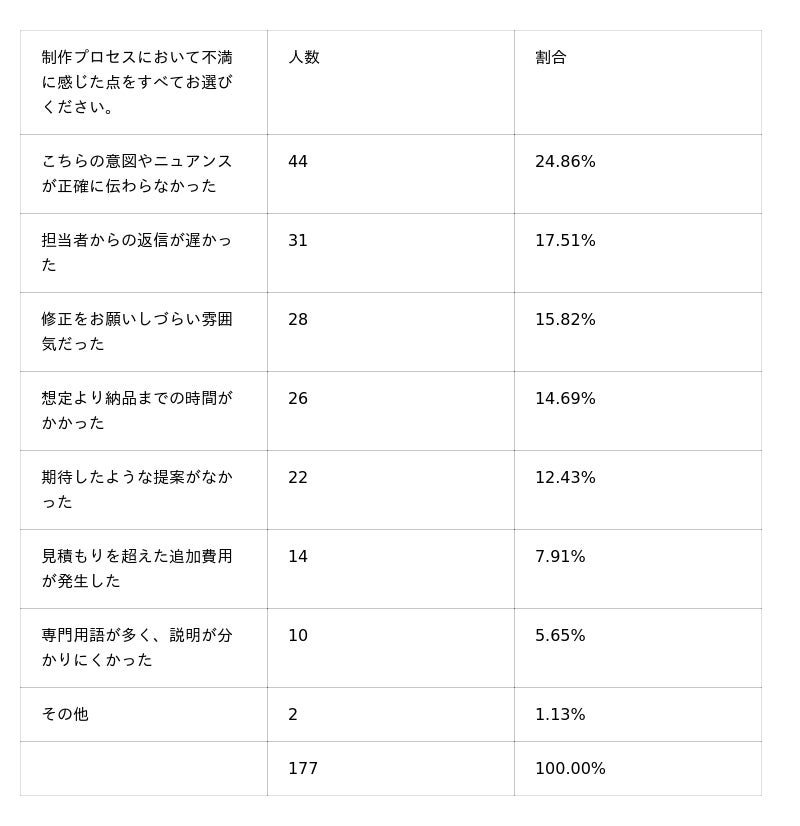 デザイン外注のプロセスにおいて、最も多く挙がった不満は「意図やニュアンスが正確に伝わらなかった」という点で、全体の24.86%を占めました。