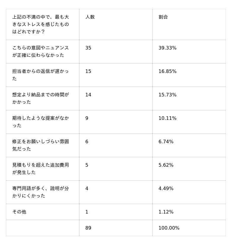 この結果は、デザイン外注においては単なるスキルや品質だけでなく、制作プロセスにおける円滑なコミュニケーションの重要性を示しています。