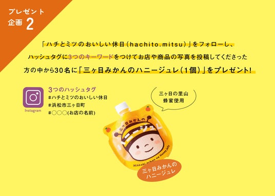 インスタグラムで、「ハチとミツのおいしい休日(hachito.mitsu)」をフォローし、ハッシュタグに3つのキーワードをつけてお店や商品の写真を投稿してくださった方の中から30名に「三ヶ日みかんのハニージュレ(1個)」をプレゼント!