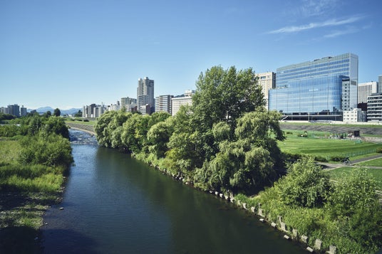 自然豊かな豊平川とインターコンチネンタル札幌(写真右奥)