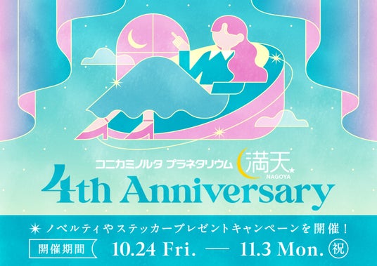エンタテインメントプラネタリウム施設「コニカミノルタプラネタリウム」のプラネタリウム満天NAGOYA(運営:コニカミノルタプラネタリウム株式会社/代表取締役社長:本由美子)は2025年10月27日(月)に4周年を迎えます。それに伴い、2025年10月24日(金)~11月3日(月・祝)の期間中、ショップ購入金額+当日鑑賞券あわせて税込み2,000円以上ご購入の方にオーロラミニポーチをプレゼント、また来場者の皆様に4周年オリジナルステッカーを配布します。