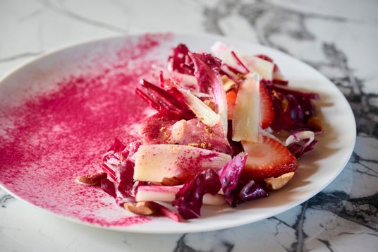 Hors d'oeuvre ルビーサラダクリスマス連想させるルビーカラーを効かせた一⽫。トレビス、ビーツ、ブッラータチーズといった具だくさんのサラダに旬のイチゴや鴨ハムをあわせ、ビネグレットで⽢酸っぱく仕上げました。