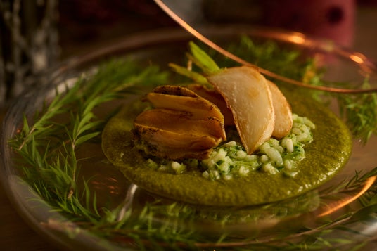 Specialite du chef鮑とカブを余すことなく使用したスペシャリテのリゾット。アワビとカブは薪焼きし、余ったカブの茎はリゾットソースに活用。仕上げにスモークで閉じ込めて香ばしさを引き立てています。濃厚なソースがクセになる一⽫です。