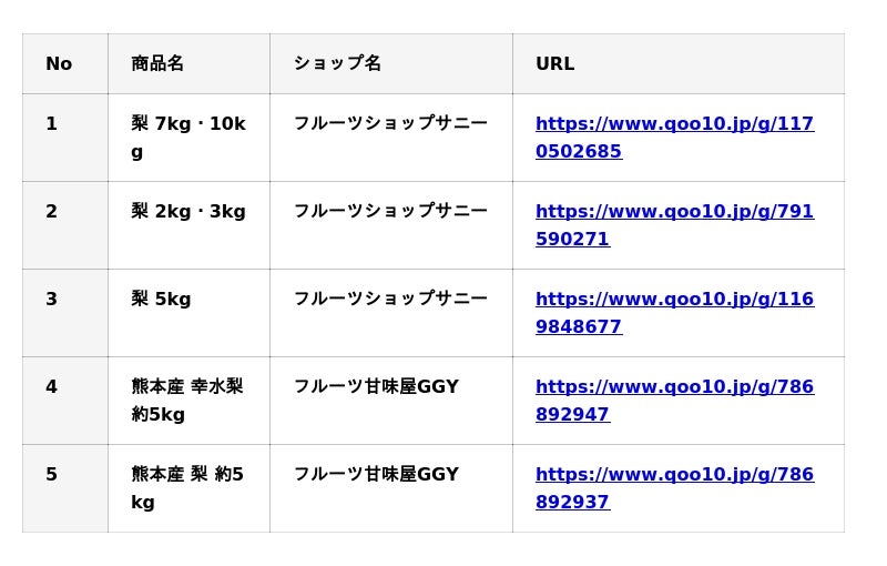 Qoo10「梨」販売数ランキング