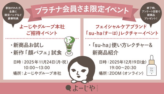 株式会社よーじや(京都府京都市下京区、代表取締役・國枝昂)が運営する、京都発のライフスタイルブランド「よーじや」は、日頃のご愛顧へ感謝を込めて「よーじやメンバーズ」のプラチナ会員さま限定イベントを2025年11月24日(月・祝)と12月19日(金)に開催いたします。 11月には、8名さま限定で弊社初となるよーじやグループ本社にご招待。新商品のお試しや新作パフェの試食など当イベントだけのプログラムをご用意しております。また、12月には30名さま限定で、新商品がもらえる!フェイシャルケアブランド「su-ha(すーは)」のレクチャーをオンラインで開催いたします。よーじやは今年3月に「おみやげの店」から「おなじみの店」を目指しリブランディングを実施いたしました。今後も 「よーじやメンバーズ」をはじめ、すべてのお客さまに、より一層ご愛顧いただけるよう、さまざまな取り組みを展開してまいります。