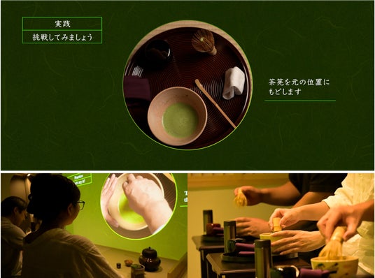 映像を見ながら、自分の手で一服を点てることが可能。初心者でも安心して参加できます。