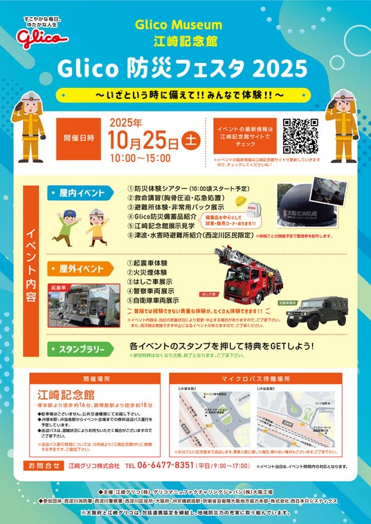 江崎グリコ株式会社は、2025年10月25日(土)に江崎記念館(大阪府大阪市)にて「Glico 防災フェスタ 2025」を開催いたします。本イベントは、異常気象や自然災害が年々増えつつある昨今、防災意識を高めるきっかけや、防災知識を広めることを目的として実施しています。大阪府庁・西淀川区役所・西淀川消防署・西淀川警察署・JR京橋統括駅・防衛省自衛隊大阪地方協力本部・株式会社西日本ロジスティクスとともに、それぞれの防災への取り組みを紹介するブースをはじめ、救命講習や避難所などの体験、警察車両や自衛隊車両も展示します。