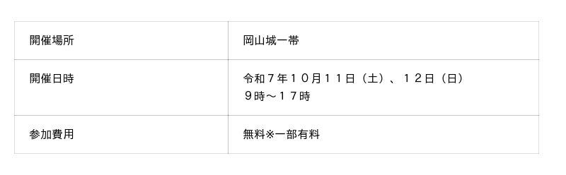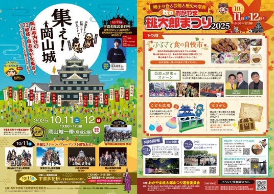 岡山城一帯(烏城公園)で、「郷土の食と芸能と歴史の祭典」をテーマとする「秋のおかやま桃太郎まつり2025 」と県内外の城郭・自治体が集結する「集え!岡山城」を同時開催します。