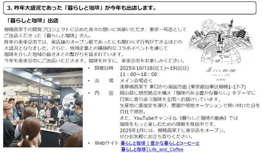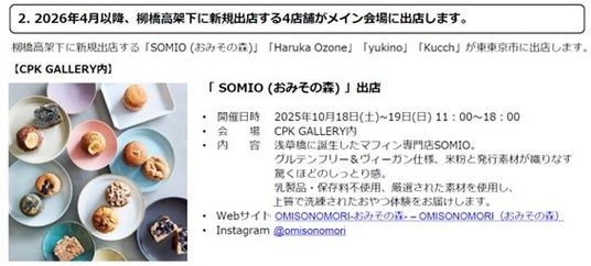 (株)ジェイアール東日本都市開発では「趣味の交差点」というコンセプトのもと、高架下から地域を盛り上げるべく柳橋高架下の開発を進めております。弊社高架下にご出店するテナントさまが、地域内外の方々と交流する貴重な機会として2025年10月18日(土)~19日(日)に行われる「東東京市(ひがしとうきょういち)6」へ協力いたします。昨年12月末にご出店くださった「暮らしと珈琲」に加え、来年の4月以降に柳橋高架下に新規出店予定である「SOMIO (おみその森)」「Haruka Ozone」「yukino」「Kucch」の他、東東京市6に出店希望をいただいた「とし田」の6店が出店いたします。また、メイン会場のとなり総武線浅草橋~両国駅間高架下にて移動動物園 (成田ゆめ牧場) を実施します。