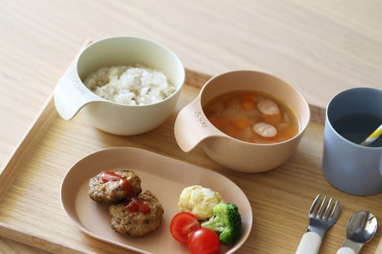 小さなお子様でも左右方向がわかりやすく、持ち手がある方に手を添えて使っていただくことで、ひとりで最後まで食べられるようにサポートします。