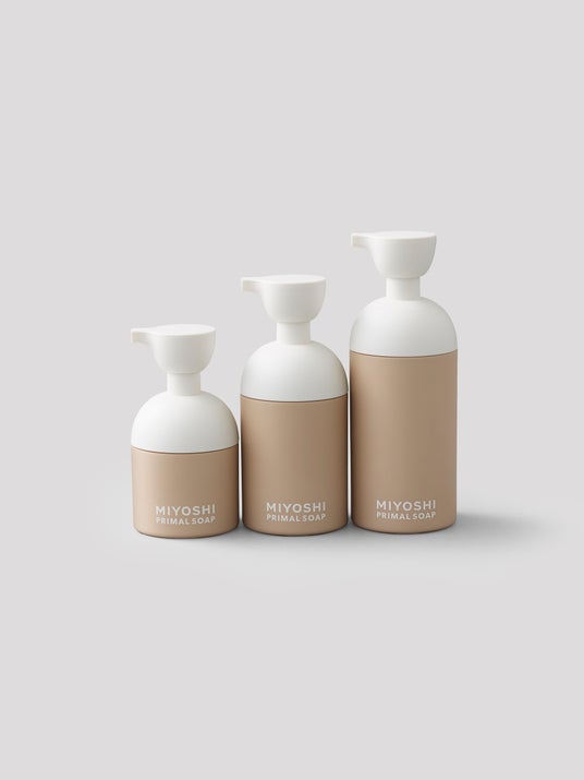 美しさと使いやすさは、日常を支える両輪です。「MIYOSHI PRIMAL SOAP」のボトルデザインを手がけたのは、日本を代表するプロダクトデザイナー・柴田文江氏。アイコニックなノズルのかたち、有機的な曲線がつくる優しい佇まい。置く場所を選ばず、どんな空間にも自然に溶け込みながら、使うたびにふと目を奪われる、静かな存在感。ベージュと白の2トーンカラーが、日々の暮らしにそっと寄り添います。