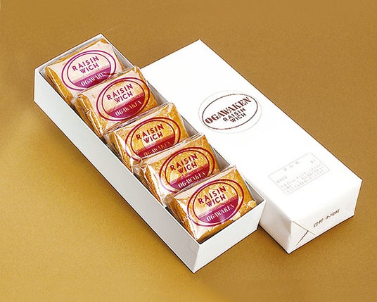 巴裡 小川軒の看板商品。洋酒に程よく漬け込まれた肉厚レーズンとクリームを、クッキーにサンドした味わい深いお菓子です。