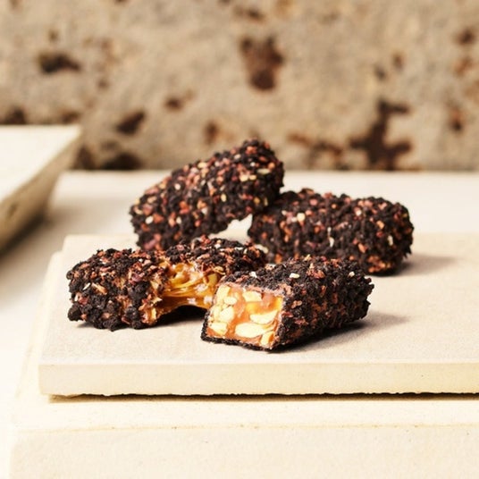 バターや生クリーム、蜂蜜を使ってコク深くなめらかに炊き上げたキャラメルヌガーにローストアーモンドを混ぜ込み、ミルクチョコレートをコーティング。カカオニブとブラッククランチと少しのココナッツをまとわせて、ほろ苦さと奥行きのある香りをプラスしました。