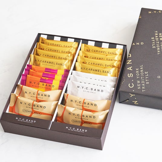 『N.Y.C.SAND』定番人気の「N.Y.キャラメルサンド」と「N.Y.スカッチサンド」に、期間限定の味「N.Y.キャラメルブリック」と「N.Y.スイートポテトキャラメルサンド」を入れた詰合せギフトボックスです。