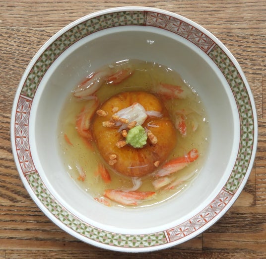 大分産のハーブ鶏を、かぼちゃを練り込んだ生地で包み込んだ南京饅頭です。しっとりとした生地の甘みが鶏の旨みをやさしく引き立て、さらに蟹の身を使った餡をかけることで、豊かな風味と贅沢さが加わります。地元食材と秋の味覚を組み合わせた一皿は、口に運ぶたびに季節の滋味 を感じさせてくれます。ほっと心和む味わいをお楽しみください。