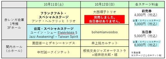 横浜赤レンガ倉庫1号館と関内ホール(小ホール)の2会場で開催されるホールライブ。11日(土)の赤レンガ倉庫は、「横浜ジャズ100年」特別企画として開催される「フランクフルト・スペシャルステージ」と「台湾・スペシャルステージ」。それぞれの地域で高い評価を受けるバンドの、ジャズプロ限りの特別なステージをお見逃しなく!