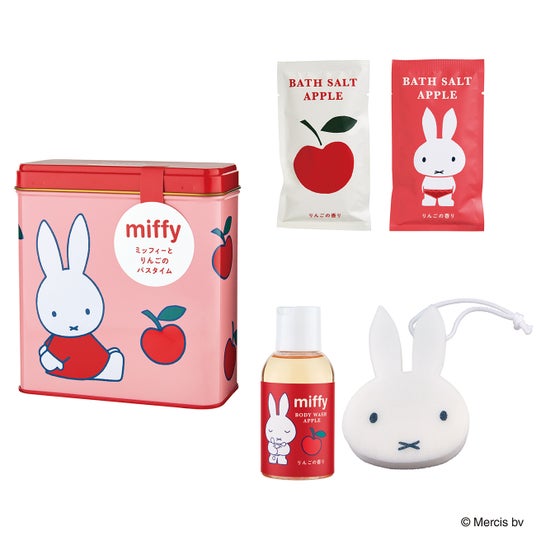りんご香るバスソルト、ボディーウォッシュとバススポンジがミッフィーデザインの缶に入ったバスコレクション。4種のフルーツエキス配合でお肌にうるおいを与えます。